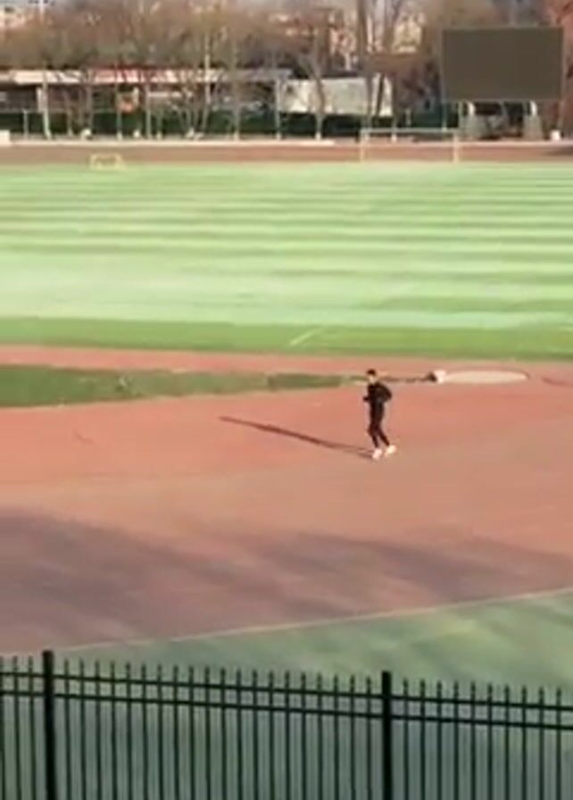 A man is running on the track of a soccer field