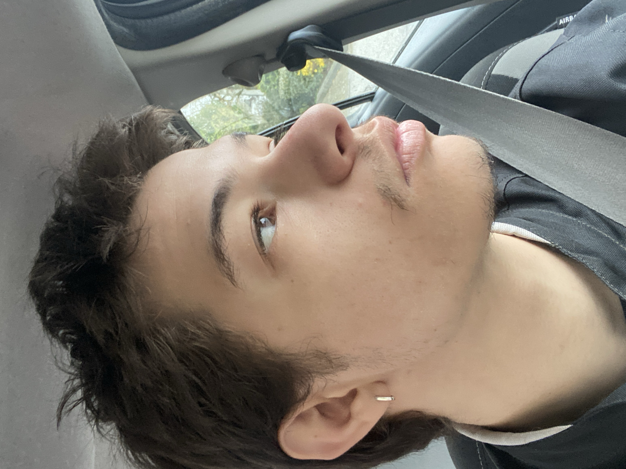 A young individual, appearing male, with medium-brown, somewhat disheveled hair, light complexion, brown eyes, and nascent facial hair (mustache and stubble), is depicted in a close-up profile shot. A single small silver hoop earring is present in the left earlobe. The individual is seated within a vehicle, wearing a dark collared garment, possibly a jacket or shirt, with a visible white collar lining. A gray seatbelt extends diagonally across the individual's chest and right shoulder. The head is turned sharply to the right, with the subject looking out the passenger-side window. The lips are slightly pursed. The vehicle's interior features a gray headliner, a dark gray door panel, and a seatbelt mechanism. Text indicating "AIRBAG" is visible on the interior trim near the subject's right shoulder. Through the vehicle window, a blurred outdoor environment is visible, characterized by green foliage suggesting trees or bushes, and hints of lighter, possibly sky or building, elements. The scene is illuminated by ambient daylight. The location is specified as the city of Truchtersheim, France.