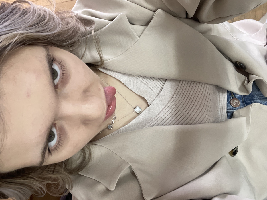 A high-angle, close-up photograph depicts a single individual, appearing to be an adult female, from the chest upwards. The individual has light-colored, wavy hair and is looking directly at the camera with a direct, intense gaze. Her eyes are open wide, revealing light-colored irises and distinct eyelashes. A small, red epidermal mark is visible on the forehead. The individual's tongue is extended from the mouth, slightly curled upwards. The individual is wearing a light beige or tan blazer or trench coat, unbuttoned at the front, over a ribbed, light-colored (possibly off-white or light beige) top with a crossover or V-neck design. Two delicate silver-toned necklaces are visible: one features three small, circular, possibly jewel-encrusted charms, and the other a white, four-leaf clover-shaped pendant. Partially visible at the bottom of the frame are blue denim jeans, secured by a metallic button imprinted with "PRIME PAUSE" text. The background is indistinct and appears to be an interior setting, devoid of specific identifying architectural or environmental details. The precise location within the city of Panagyurishte, Bulgaria, cannot be determined from the visual information provided in this image.
