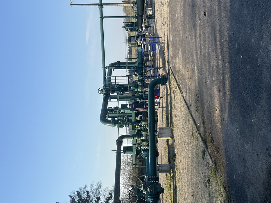 The image displays an industrial facility, identified as being in Carvin, France, under a clear blue sky. A complex network of large, dark green industrial pipes, valves, and support structures dominates the midground. The pipes run horizontally, supported by concrete pedestals, and vertically, forming a dense arrangement with numerous large handwheels indicating control points. One individual, dressed in dark clothing and a white hard hat, stands near the center of this piping system, facing generally towards the equipment in an observational posture. In the immediate foreground, a dark asphalt surface transitions into a light-colored gravel or crushed stone area that surrounds the industrial equipment. Several blue metal safety barriers are positioned at the base of the piping structure. To the far left, a deciduous tree with bare branches is visible, while the distant background features open fields under the clear sky. A wooden utility pole with wires is partially visible on the far right. Strong shadows are cast from left to right across the foreground, indicating direct sunlight.