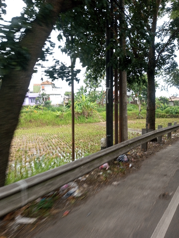 This image depicts a roadside scene in Khajuripada, India, captured with motion blur. In the foreground, a dark asphalt road with a partial white line runs diagonally from the lower left to the right. Adjacent to the road, a silver-colored metal guardrail stretches across the lower mid-section of the frame. Beneath the guardrail, on a strip of dirt and sparse vegetation, various items of trash are scattered, including plastic bags and unidentified debris. Beyond the guardrail and the roadside dirt, a flooded rice paddy field extends into the midground, showing patterns of young, green rice plants. Several utility poles, appearing to be a mix of dark and lighter-colored concrete or wood, stand vertically within or at the edge of the paddy field. Numerous trees with dense green foliage are visible, primarily along the right side and partially obscuring the upper left. In the background, beyond the fields and trees, several residential buildings are partially visible. These include a two-story structure with purple-painted walls and white trim on the left, and other white or light-colored buildings with red or orange tiled roofs further right. The sky overhead appears overcast. No individuals or specific actions are discernible within the frame.