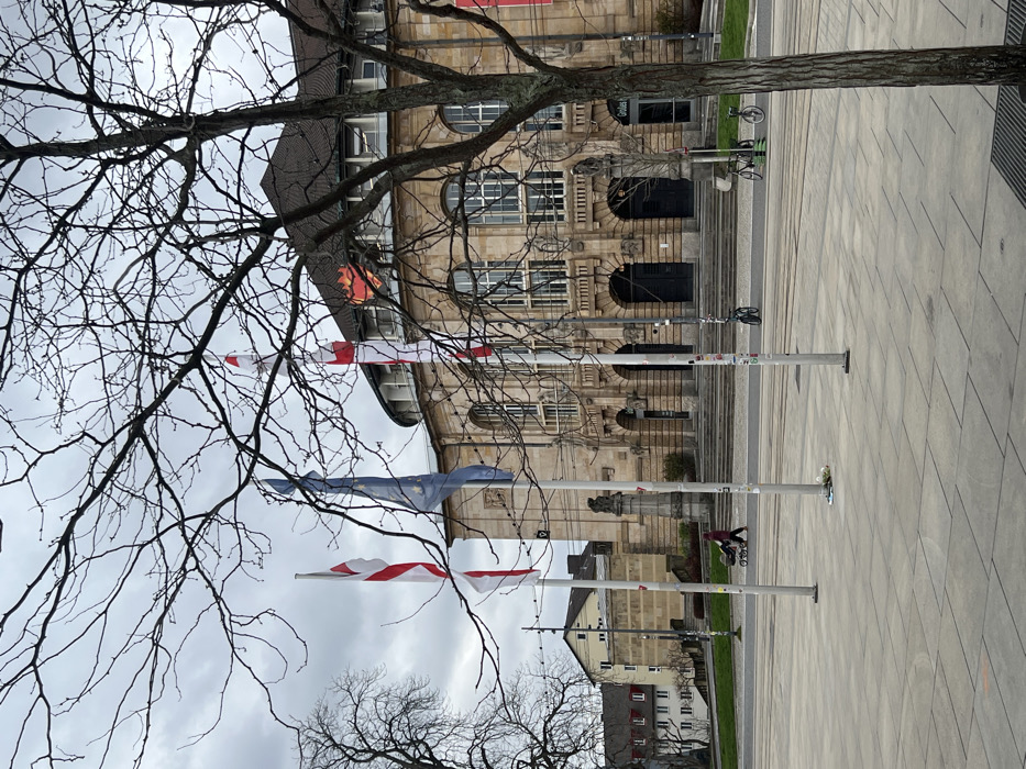 The image displays the Theater Freiburg in Freiburg im Breisgau, Germany, under an overcast sky. The prominent light-colored stone building features classical architectural elements, including multiple arched windows, elaborate stone carvings, and several dark, arched double-door entrances accessible via a wide staircase. A reddish-brown tiled roof tops the structure, with a distinct red heart-shaped design visible on the roofline. In the foreground and right mid-ground, a bare deciduous tree partially obscures the view of the building and the sky. The immediate foreground consists of a large, light-tiled public square. Three flagpoles stand in a line on this square; two display white flags with vertical red stripes, and the central pole flies the blue European Union flag. A single individual, dressed in dark clothing, walks from the left to the right across the tiled square, pushing a dark-colored baby stroller. Between the square and the theater building, a street with visible tram tracks runs horizontally. Several bicycles are parked along the curb of this street. To the left of the main building, in the background, multiple-story residential buildings with light facades and dark, pitched roofs are visible. The lighting is diffused, consistent with an overcast day in a season when deciduous trees are without leaves.