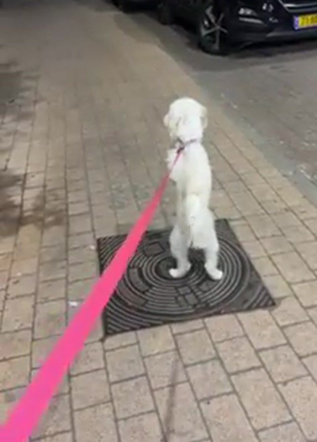 small, white dog standing on its hind legs on a manhole cover on a sidewalk. The dog is wearing a collar and is attached to a bright pink leash. The sidewalk is made of light-colored square pavers. In the background, two cars are parked along the curb. The video is taken at night, and the lighting is dim. The dog briefly stands upright, then drops to all fours and continues walking down the sidewalk, pulling the leash.