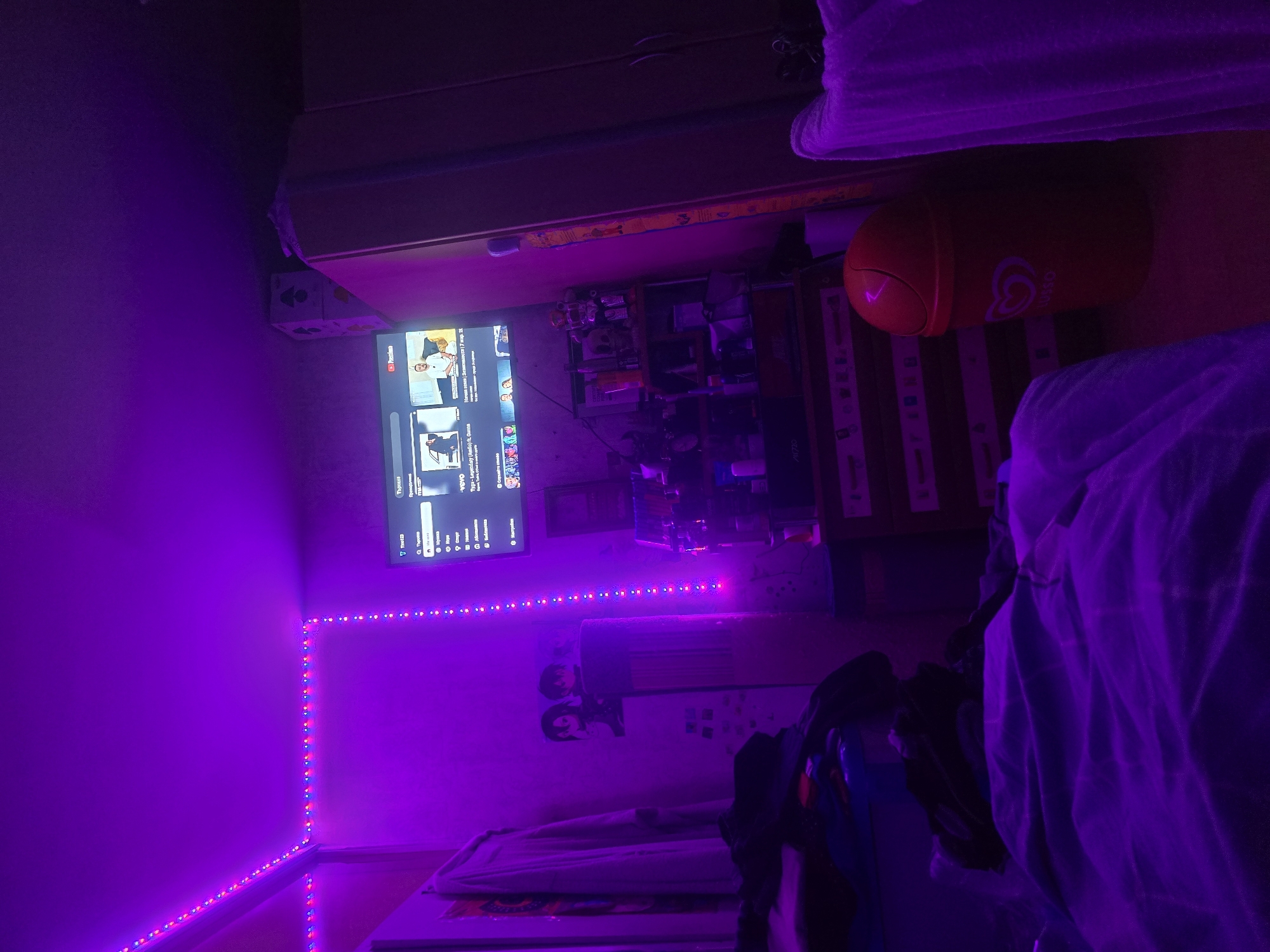room with a TV displaying a YouTube screen with Cyrillic text including the words "Premio", "Търсене" (search), "Музика" (music), "vevo", and "Tyga-Legendary (Audio) ft. Gunna". The TV screen also indicates "Нагоня земя | Зазменимости 17 мар. 21". LED strip lights illuminate the wall with a purple hue. A shelf unit filled with various objects is positioned near the TV. Other items such as an orange cylindrical object and what appears to be clothing are in the foreground. There is also a poster on the wall and general clutter suggesting a personal living space. Given the Cyrillic text, it's likely the room is located in Bulgaria, but without more specific information, I cannot provide a location in the city of Sofia.