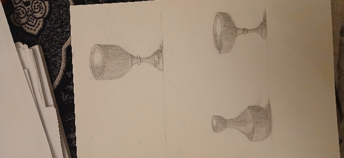 The image displays a close-up, top-down view of a light-colored sheet of paper featuring three graphite pencil drawings of decorative vessels. In the upper portion, a shaded drawing of an ornate stemmed goblet or chalice with a textured bowl stands centrally. Below, divided by a faint horizontal line, are two additional drawings. On the left, a shaded drawing of a tall, narrow-necked vase with a bulbous body is depicted, casting a shadow to its right. On the right, a wide, shallow stemmed compote dish or goblet, also shaded and casting a shadow, is visible. The paper rests on a darker surface, possibly fabric, exhibiting a faint dark-on-dark patterned design in the upper right background. A stack of additional white papers is partially visible along the upper left edge of the frame. The visual content of this image does not provide information to determine its specific location within the city of Al-Midan Municipality, Syria.
