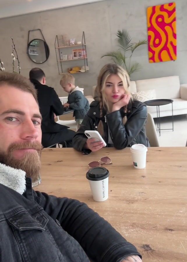 . The video shows a man and a woman sitting at a wooden table in a cafe. The man is holding a phone and appears to be recording a selfie video. The woman is holding a cell phone and looking at it. Two other customers and a child are seated at the table behind them. The man raises his coffee cup and smiles at the woman who raises her coffee cup in response. The man appears to be talking to the camera as the video ends.