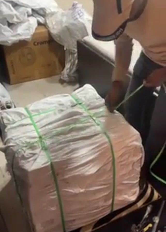 A person wearing a beige cap, light-colored long-sleeve shirt, and jeans is standing next to a large, square package wrapped in white plastic and secured with green straps