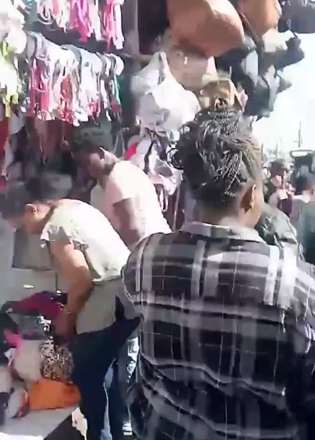 crowded marketplace. Many people are visible, and many are walking. There are structures of some sort along the edges of the shot, presumably market stalls. The sign for Gikomba Market is visible in the background.