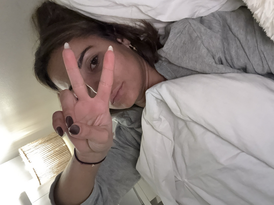 A young woman is positioned in bed with white blankets and a gray hoodie. She makes a peace sign with her left hand towards the camera. Her nails are painted dark. A nightstand lamp sits to the left. The woman has long brown hair.