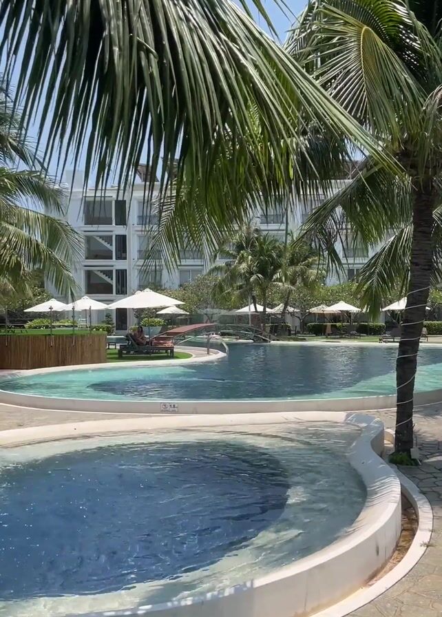 swimming pool area at a resort or hotel. Palm trees frame the view, partially obscuring a white building in the background. There are several white umbrellas and lounge chairs around the pool. The pool itself is a light blue color with an irregular shape, featuring a smaller, circular section in the foreground. The area is paved with what appears to be light-colored stone. In the distance, people can be seen relaxing on lounge chairs. The day appears sunny and bright.