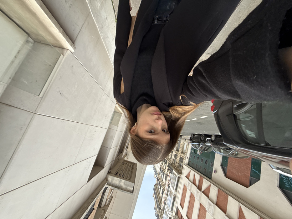 A woman wearing a black turtleneck and coat poses on a street lined with buildings. Parked cars line the roadside, and the sky is visible in the distance. The buildings are diverse in style, some with a modern facade and others more traditional with red brick accents. The image is taken at an unusual angle.