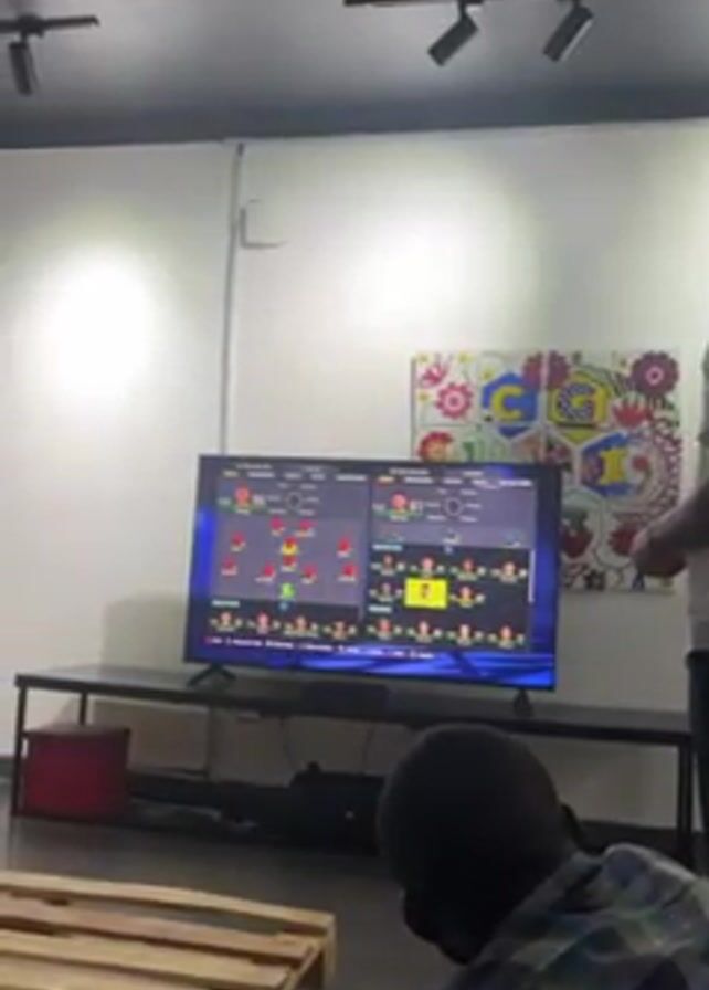 Two people are playing a soccer video game on a large television in a brightly lit room. One person is standing, holding a game controller, while the other is seated on a makeshift couch made of wooden pallets, also holding a controller. The TV displays the team formations for the game, with player ratings visible. The room has white walls and multiple track lights on the ceiling. The room has a few pieces of furniture, including a black TV stand and a red ottoman. There is also a colorful decorative piece on the wall next to the TV.