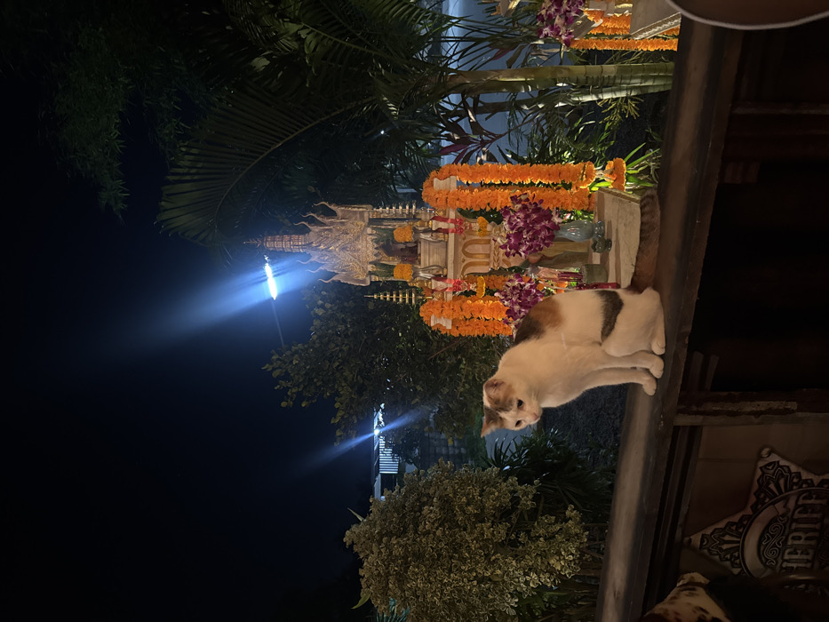 A calico cat, predominantly white with brown and dark patches, sits on a dark wooden railing in a nighttime setting in Moo 1, Thailand. The cat is facing left, with its tail extending along the railing to the right. Behind the cat, an ornate Thai spirit house (San Phra Phum), featuring white and gold-colored elements and a tiered roof, is prominently displayed. It is heavily adorned with multiple orange marigold garlands and arrangements of purple orchids. Lush, dark green tropical foliage, including palms and other trees, surrounds the spirit house and extends into the background. Artificial light sources are visible, with a prominent streetlamp in the upper mid-right casting a blue light and lens flare, and other faint illuminated structures visible through the background vegetation.