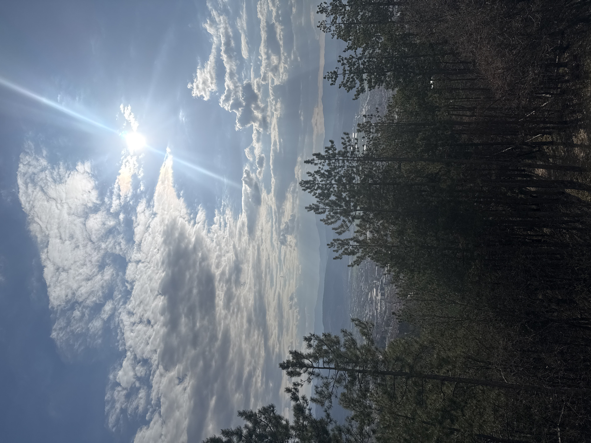 The image presents an elevated view overlooking the city of Blagoevgrad, Bulgaria. The upper portion of the frame features a blue sky with scattered cumulus and stratocumulus clouds. The sun is visible in the upper right, emitting a strong lens flare and distinct crepuscular rays that penetrate the cloud cover. The midground is dominated by a dense forest of tall, dark evergreen pine trees, interspersed with some bare deciduous branches on the right. Below the treeline, the urban area of Blagoevgrad is visible in the valley, characterized by numerous buildings and infrastructure. In the distant background, multiple ranges of mountains are discernible under atmospheric haze. No individuals or specific actions are depicted. The immediate ground under the trees is heavily shadowed.