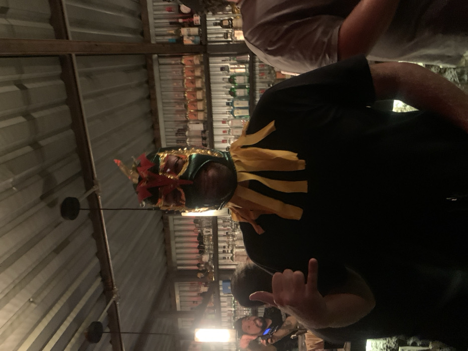 The image depicts an indoor bar setting in Mexico City, Mexico. A central figure, likely a male, is facing forward, wearing a green, gold, and red lucha libre mask with yellow fabric strips around the neck and a plain black t-shirt. Their right hand is raised, performing a 'shaka' gesture. In the background, multiple shelves are fully stocked with various liquor bottles, illuminated by ambient lighting. The ceiling is constructed from corrugated metal with visible support beams. To the central figure's right, a partial view of another individual wearing a light-colored t-shirt is present. On the far left, a partially obscured bearded man is visible, holding a mobile phone. A specific location or establishment name within Mexico City is not discernible from the visual evidence.