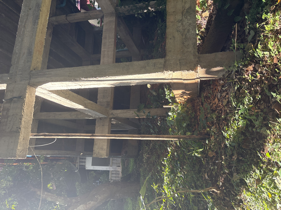 An unfinished concrete structure with exposed beams and columns dominates the left side of the frame. Sunlight creates stark contrasts on the concrete surfaces. To the right, overgrown vegetation, including leafy plants and fallen leaves, spills onto the ground. A horizontal wooden pole cuts across the mid-ground. Further in the background, a partially visible building with a white window or door is discernible amongst the foliage. The scene appears to be an outdoor construction site merging with a natural environment.