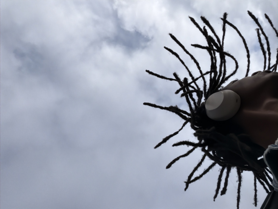 The image depicts a low-angle view of an individual's head, seen from the side, looking upwards towards an overcast sky in Rosny-sous-Bois, France. The person has dark-colored dreadlocks that are silhouetted against the sky, extending upwards and outwards. A single, light-colored (possibly white or off-white) over-ear headphone cup is visible on the side of the head, covering the ear. The sky is predominantly gray with visible cloud formations, indicating an overcast or partly cloudy condition. No other environmental details, structures, or additional individuals are present.