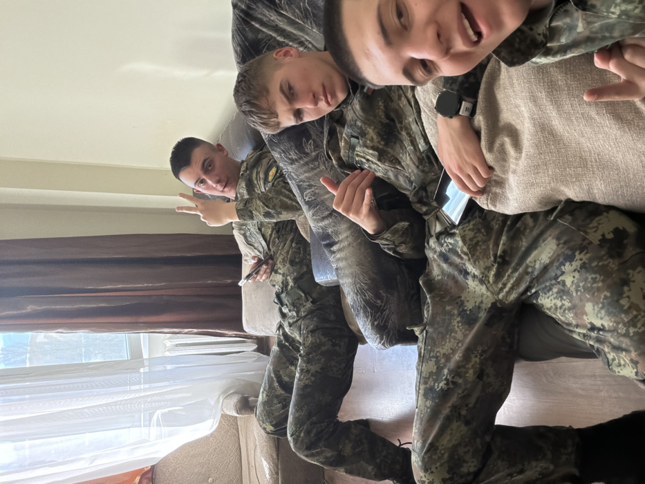 Three young adult males, dressed in digital camouflage military-style uniforms, are depicted in an indoor living space, identified as Sofia, Bulgaria. The individual positioned on the left is seated on a light-colored sofa, holding a dark smartphone in his right hand, and making a "peace" sign with his left hand while looking towards the camera. A yellow and orange emblem is visible on his right sleeve. The central individual is also seated on the sofa, partially obscured, with a dark smartphone on his lap and his left hand forming a "thumbs up" gesture. A patch consistent with the Bulgarian flag (white, green, red tricolor) is visible on his left shoulder. The individual closest to the camera, partially visible on the right, appears to be taking a selfie, smiling with an open mouth, and forming a "peace" sign with his right hand. A black smartwatch is present on his left wrist. The environment features a light-colored wall and dark wooden flooring. A large window on the left, covered by sheer white and brown curtains, allows natural light into the room. A white radiator is situated beneath the window. An upholstered armchair with a light pattern is visible on the far left. The individuals are relaxed, with two subjects directly engaging the camera through gestures.