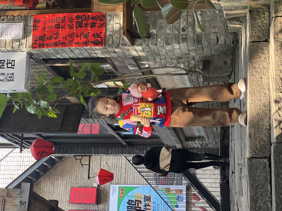 A child in a colorful sweater and brown pants stands on a stone walkway, holding a pink plush pig toy. Behind her, a person in a black jacket walks up stairs. The scene is flanked by brick buildings, one adorned with red lanterns and signs with Chinese characters. A green sign with the word "XUPENG" in large letters is visible. Additional signs with Chinese characters and English translations are interspersed on the walls. A small tree branch extends into the frame.