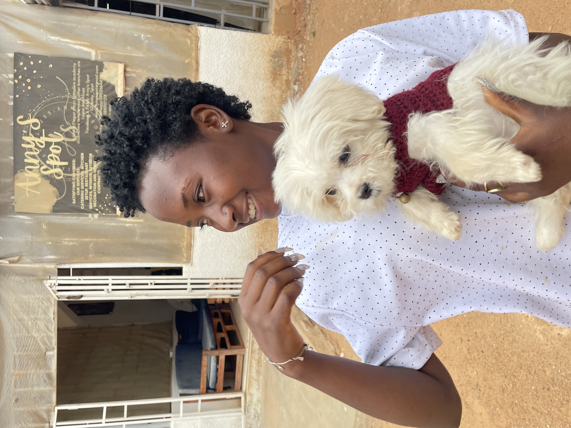 A woman is holding a small, white dog wearing a red sweater. The woman has dark skin, short, curly black hair, and is wearing a white shirt with small black dots. She is smiling and looking down at the dog. A sign in the background reads "Anny's Spot" and includes information about catering services and other business details. The sign also mentions locations in Lagos and Abuja. The location is most likely Barakin Akawo, Nigeria, based on the information on the sign. The environment appears to be outdoors near a building with a white window frame.