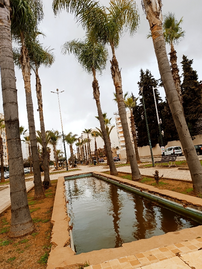 This image depicts a wide urban promenade or boulevard in Meknes, Morocco, under an overcast sky