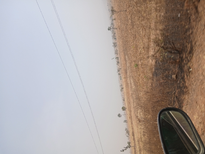This image captures a wide-angle, exterior view of a dry, open landscape in Bokana, Nigeria, as observed from a moving vehicle
