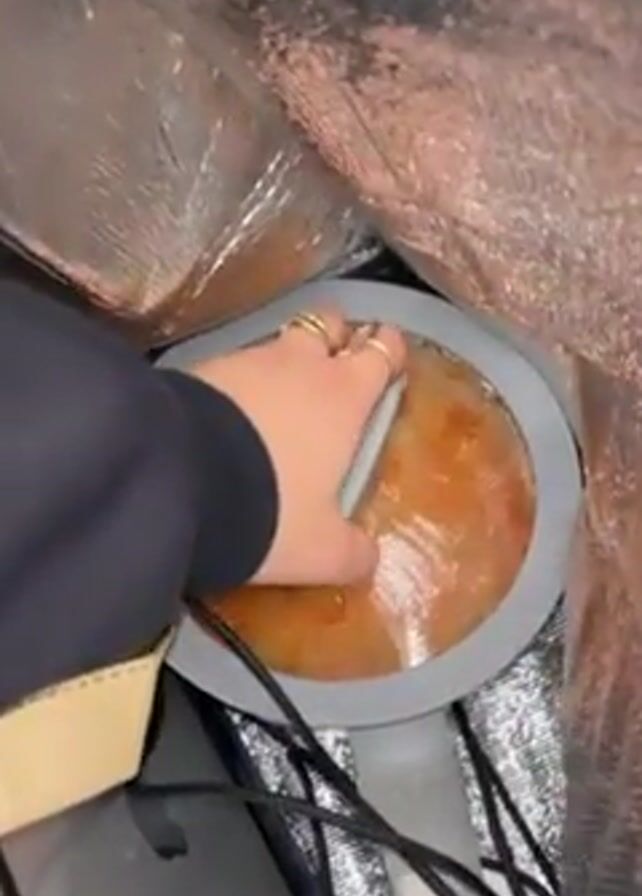 A person lifts the lid off a pot inside a insulated bag, revealing bowtie pasta in a reddish sauce. The insulated bag has a reflective silver lining, and a dark-colored electrical cord is also visible.