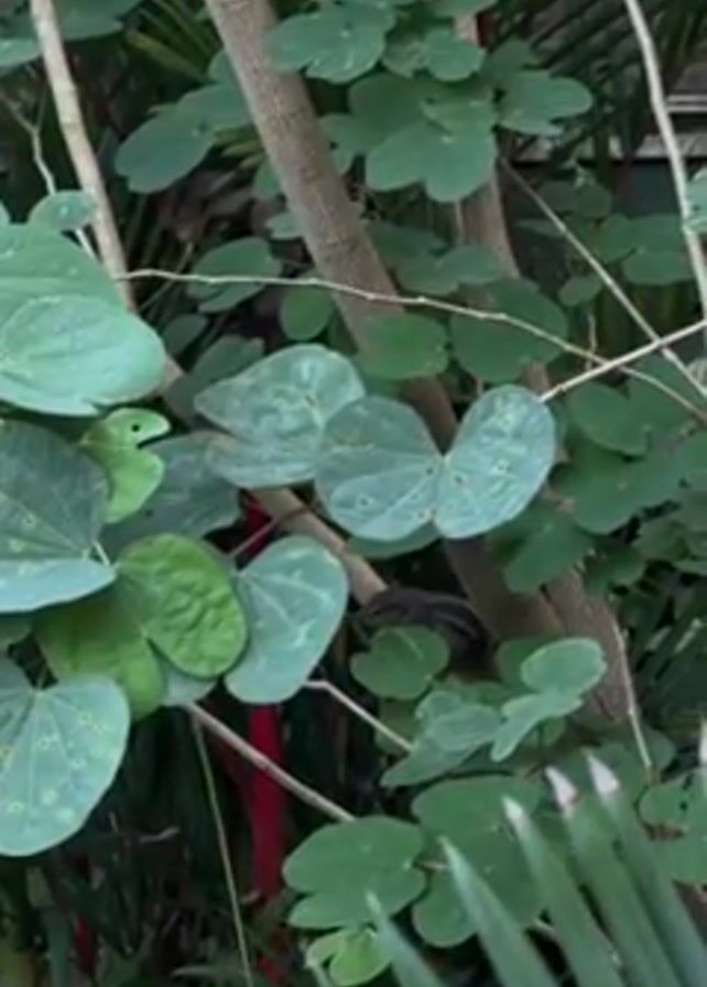 The camera captures a scene within a lush green environment, focusing on a tree with round, butterfly-shaped leaves. Amidst the foliage, a dark-colored squirrel is visible, its presence partially obscured by the dense vegetation. The camera remains static, maintaining a fixed viewpoint throughout the recording.