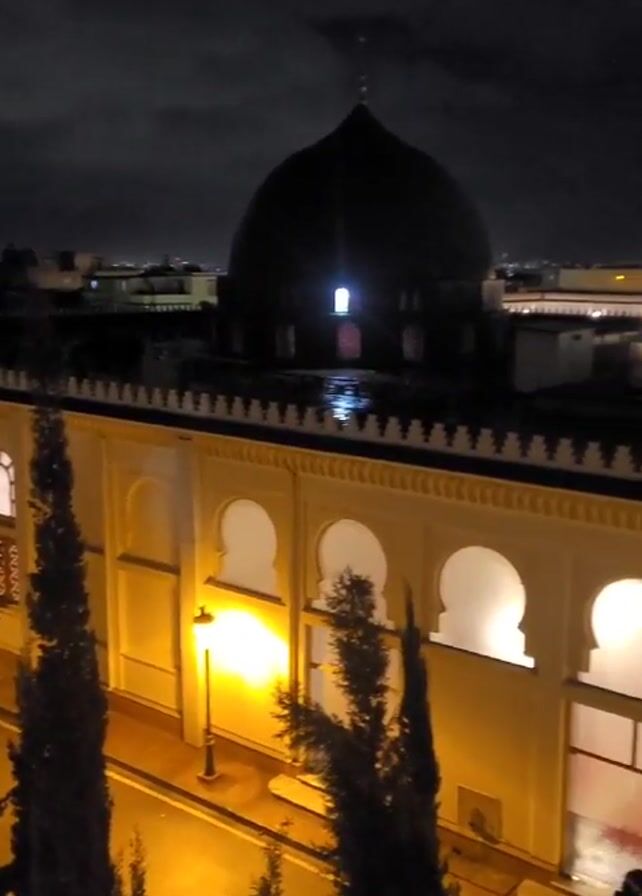 At night, a high-angle static shot reveals a building with a large dark dome atop, its details obscured by darkness, with a single illuminated window. The building's lower section features an arcade of several archways, which are brightly lit from within. A street below is illuminated by lampposts, casting a yellow glow on the wet surface. Dark trees are visible between the camera and the building, adding a sense of depth. In the background, the city's lights twinkle against a dark, cloudy sky. The building's architecture suggests a Middle Eastern or North African style.