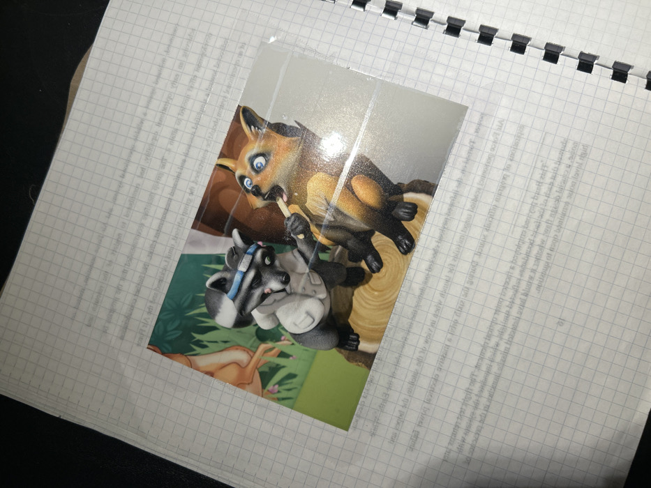 A photograph shows a cartoon-like scene featuring a fox and a raccoon-like character