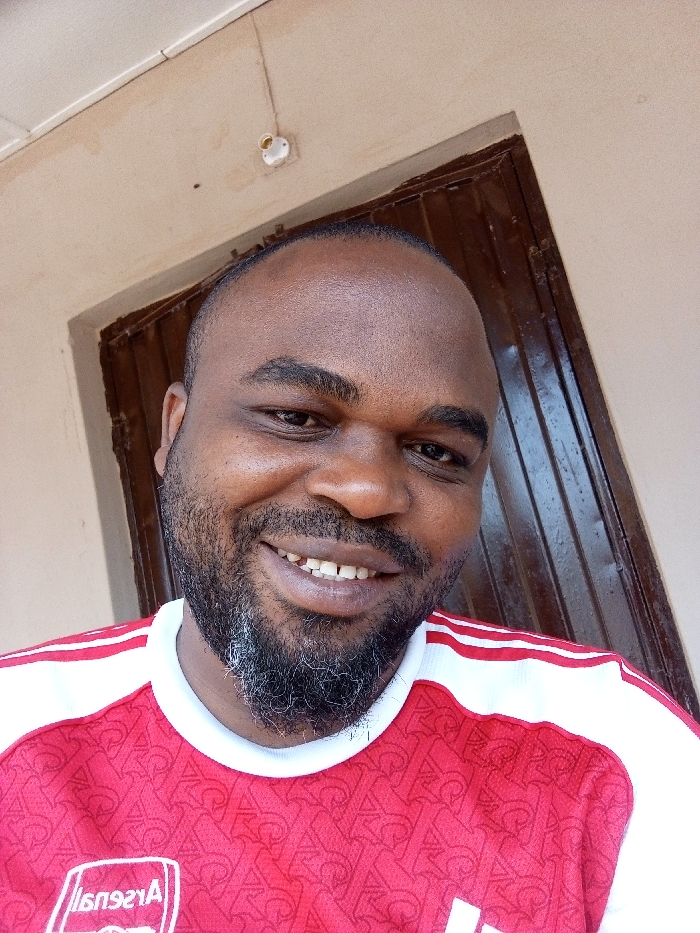 A dark-skinned adult male is depicted in a close-up, upward-angled portrait, likely a selfie, taken in Sabon Tasha, Nigeria