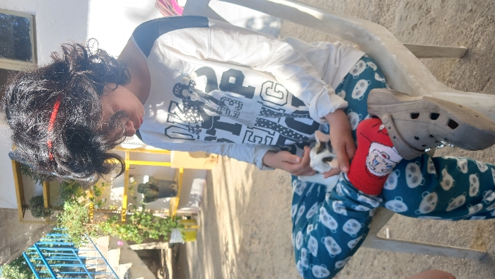 In an outdoor setting in Menderes, Turkey, an individual with dark, curly hair secured by a red headband sits on a light-colored plastic chair. The person is dressed in a white long-sleeved shirt with black shoulders and a graphic print, blue pajama pants featuring white bear or panda patterns, a red sock with a Santa Claus design on the visible foot, and a grey Crocs-style sandal. Their gaze is directed downward, focusing on a small white and black kitten held in their lap. The ground is composed of light brown dirt or compacted earth. In the background, a concrete staircase with a blue metal railing is visible on the left. To the right of the staircase, a white wall supports three yellow shelves displaying various potted plants, including a cactus. The scene is illuminated by natural daylight.