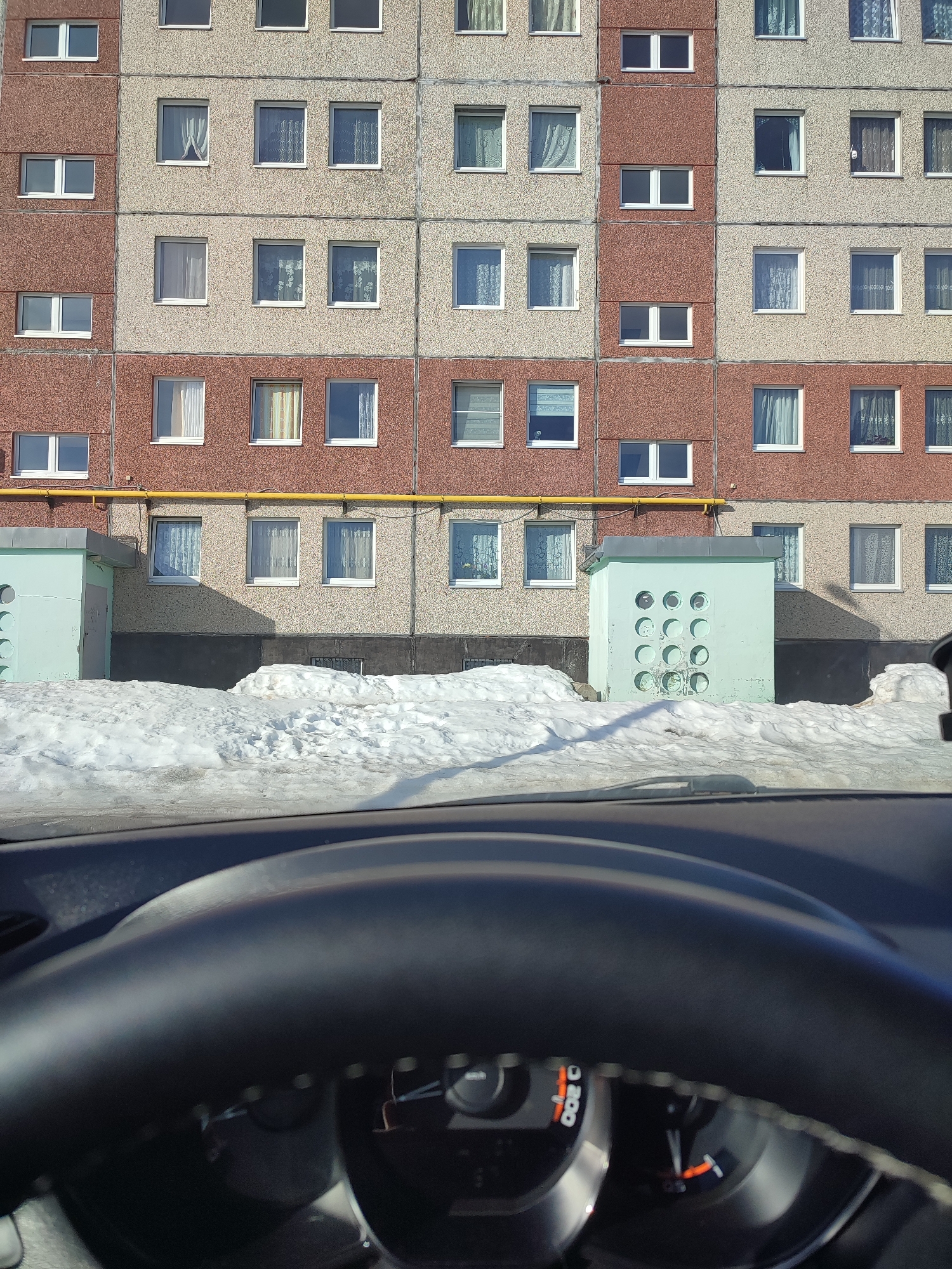 The image depicts a view from inside a car, looking out at an apartment building and a snow-covered area. The focus is on the building and the exterior environment, with the car's dashboard and steering wheel partially visible in the foreground. The apartment building is a multi-story structure, characterized by a repetitive pattern of windows and alternating sections of gray and red textured facade. A yellow pipe runs horizontally along the lower portion of the building. Below the windows, there are pale green structures, possibly utility boxes, partially obscured by snow. The ground is covered in snow, suggesting a winter environment. The snow is piled up and appears somewhat dirty or melting. The car's dashboard is visible in the foreground. The steering wheel dominates the lower part of the frame. The instrument panel shows gauges, including one with a red indicator. The image suggests a stationary position inside a vehicle, possibly observing the apartment building and the surrounding snow-covered area. The location is identified as Unknown, Unknown.