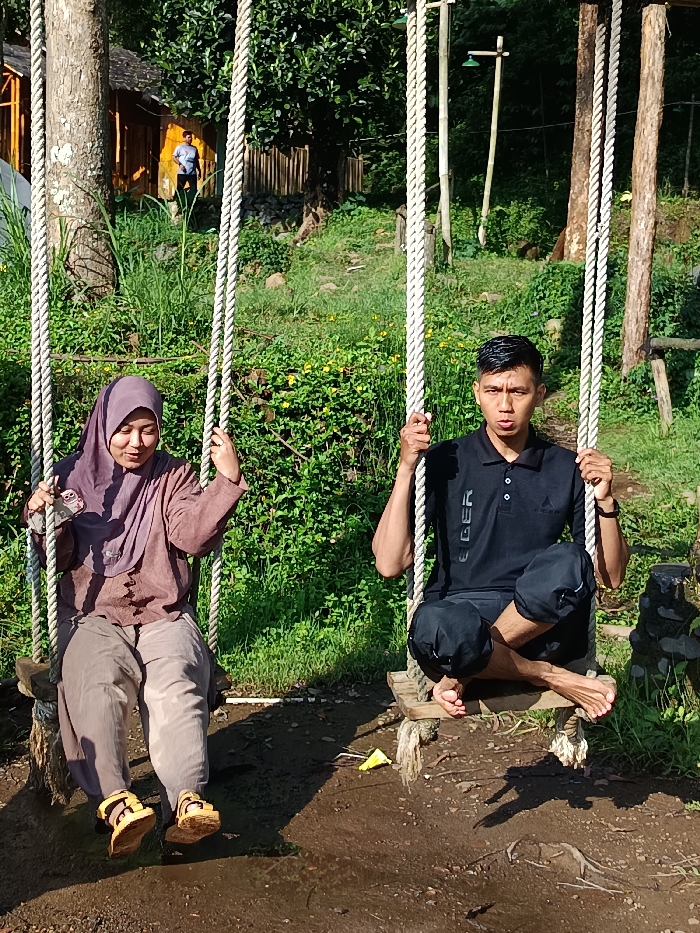 The image displays an outdoor scene in the city of Unknown, Indonesia, featuring two individuals seated on rope swings