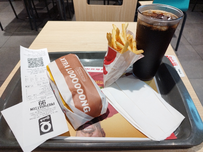 A fast-food meal from Quick is on a gray tray. It includes a long sandwich wrapped in brown paper, french fries in a white and red wrapper, a glass of dark soda with ice, and a stack of white napkins. A Quick receipt with a QR code and "Preparation 99" is on the side. The tray rests on a light brown table, and chairs are visible in the background. The sandwich wrapper reads "XTRA LOOOOOONG."