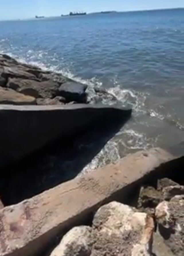 sunny, clear day at the ocean, with several large ships visible on the horizon. Waves gently lap against a rocky shoreline interspersed with aging concrete structures. The camera tilts upward to reveal the expanse of the sea and the clear blue sky. There are no people visible in the scene.