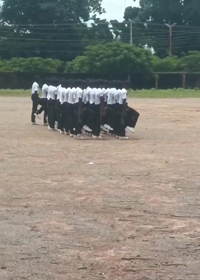 A group of people in uniform are marching in formation on a dirt field. The uniform consists of a white shirt, dark pants, and white shoes. They are marching in a straight line, with their arms swinging in unison. The field is surrounded by trees and power lines. The sky is overcast.