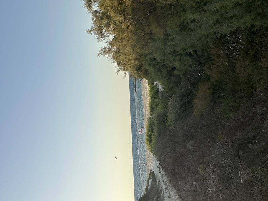 The image displays a coastal scene within the Hof HaCarmel Regional Council, Israel, featuring a sandy beach and the Mediterranean Sea observed through an opening in dense foreground vegetation. The lower half of the frame consists of mixed shrubbery, with dry, dark-branched bushes on the left transitioning to lush, green, needle-leafed trees on the right. A sandy pathway extends from the lower left towards the beach. On the sandy shore, two human figures are present; one stands near the water's edge, and a second, indistinct figure is positioned further right. A red and white sign, possibly a warning or informational marker, is visible on the sand. Light-colored rock formations or structures are located in the shallow, blue-green waters of the sea, where moderate waves are breaking. The sky above is clear, transitioning from a light blue overhead to a warm, yellowish hue at the horizon, indicating ambient light typical of sunrise or sunset. A dark, crescent-shaped object, either a bird or a distant aircraft, is airborne in the upper left portion of the sky.