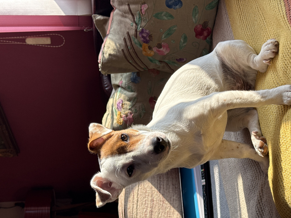 - "A young Jack Russell Terrier, predominantly white with brown markings over its right eye and on its right ear, with a smaller brown patch on its left ear, is seated upright on a bright yellow woven cushion" by FM-fASGr2, licensed under CC BY 4.0