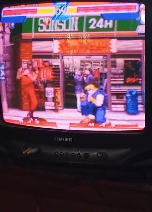 person playing the video game Street Fighter on a Samsung CRT television. The game is displayed on the screen, showing two characters fighting in front of a building that appears to be a convenience store. The characters are engaged in combat, with one appearing to be in a crouched position while the other is standing. The television is sitting on top of a dark-colored wooden dresser. Cables are visible near the front of the TV. The camera angle is from slightly below the TV, looking upwards towards the screen.