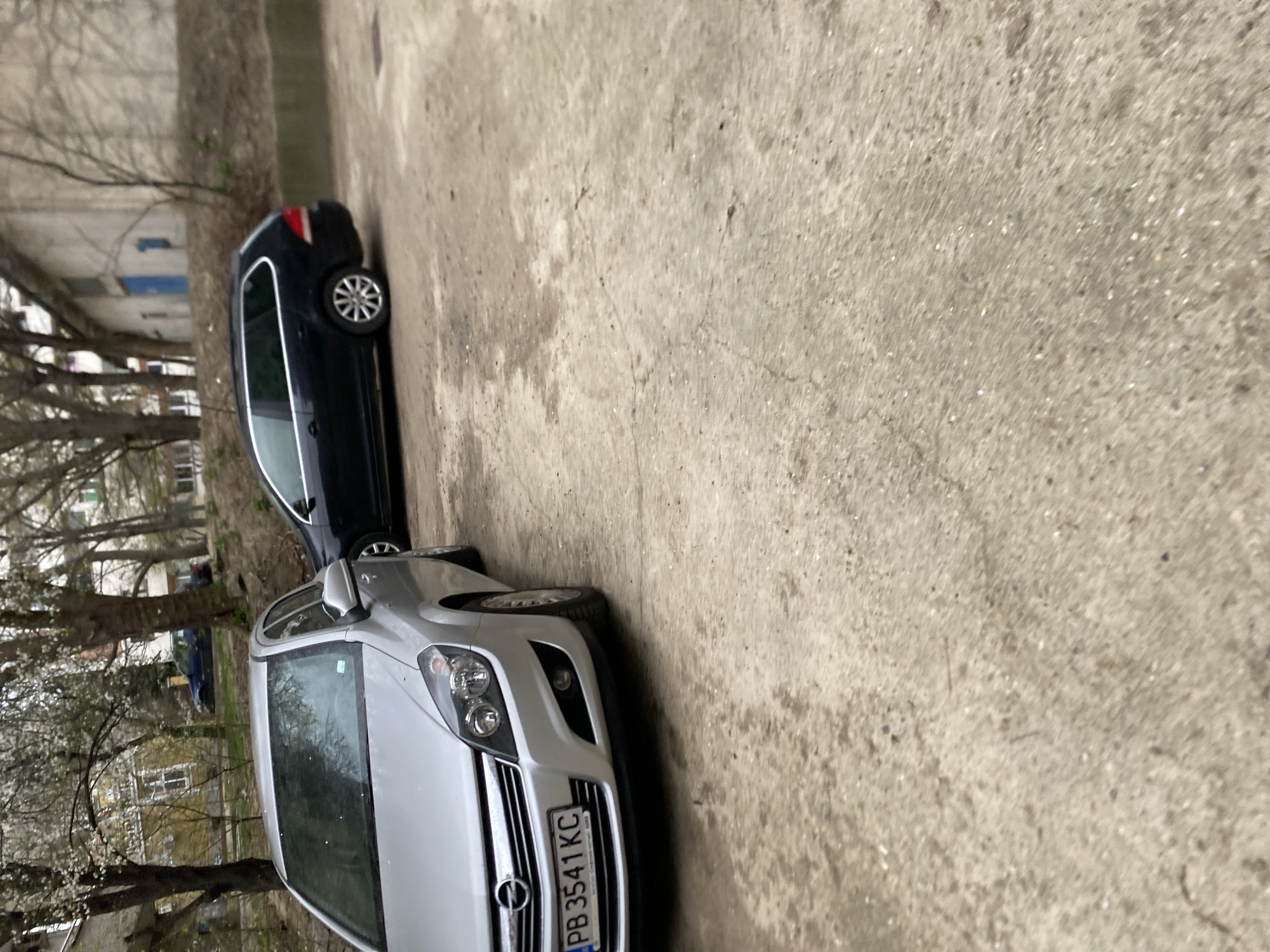 The scene depicts an outdoor parking or unpaved area in Stara Zagora, Bulgaria, under an overcast sky. In the immediate foreground, a rough, light grey concrete or dirt surface occupies the lower half of the frame. Two vehicles are prominently featured: a silver Opel Astra hatchback (likely J-generation, based on headlights and grille) is parked on the left, angled slightly towards the viewer, displaying Bulgarian license plate PB 3541 KC on its front bumper. Behind and to the right of the Opel, a dark blue or black Volkswagen Golf VI station wagon (Variant) is parked, facing right. Further in the background, an urban environment is visible, characterized by several deciduous trees with sparse white blossoms, suggesting early spring. Beyond the trees, various multi-story buildings are present, including a light yellow structure with multiple windows and a grey/beige building featuring a distinct blue door or shutter. A third, dark blue sedan (make and model indistinct) is partially visible further in the background, nestled among the trees. No individuals are present, and no actions or interactions are depicted. The overall environment suggests a residential or mixed-use urban setting with informal parking.