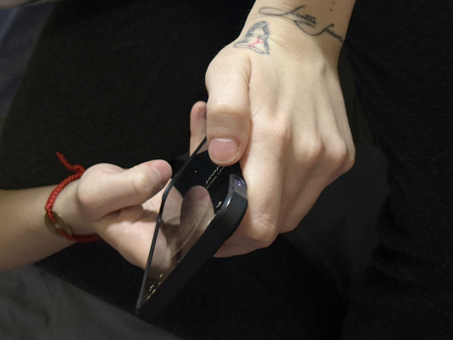 Two hands hold a black phone case. The right hand, adorned with wrist tattoos, secures the top corner of the case. The left hand, wearing a red braided bracelet with a coin, pushes the case from the bottom corner. The phone is not visible, only its case. The background is a dark, soft material, possibly clothing.