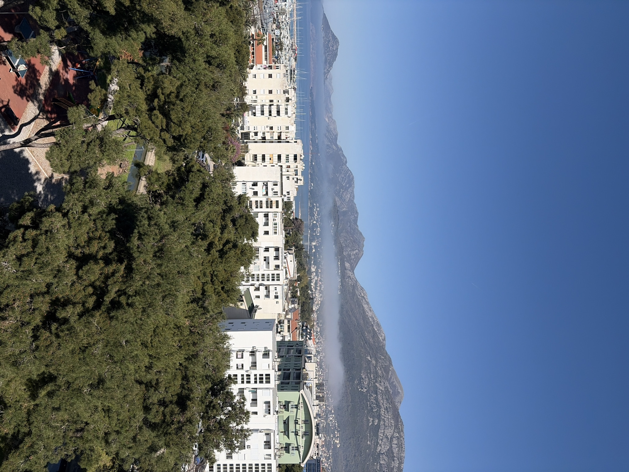 sunny cityscape in Bar, Montenegro. In the foreground, dense green trees obscure the base of a residential area with buildings of white and light-colored concrete, some featuring visible air conditioning units. Buildings are of varied heights, including multi-story apartments. A marina with many sailboats is visible in the mid-ground, beyond the apartment buildings. In the background, the rugged Dinaric Alps rise sharply, with a layer of mist or fog obscuring the lower slopes. The sky is a clear, bright blue. The image is oriented vertically. In the upper left of the image there appears to be a playground.