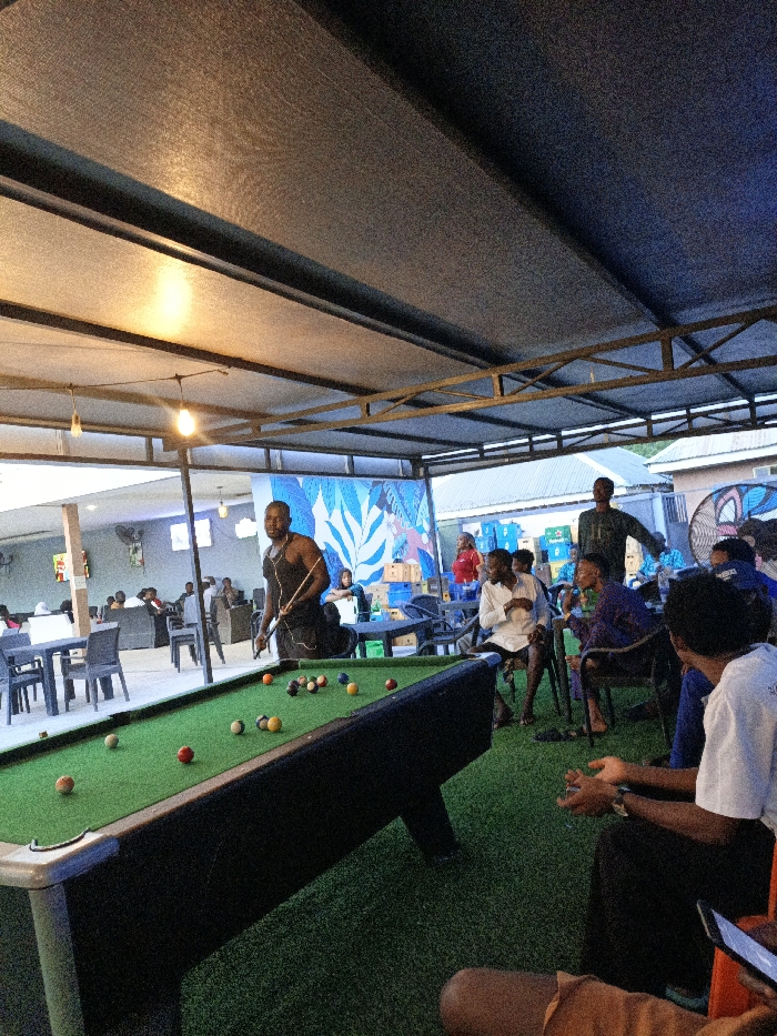 The image depicts an outdoor or semi-outdoor recreational area in Unknown, Unknown, under a dark grey canopy supported by metal trusses. The ground is covered with green artificial turf. Multiple exposed incandescent light bulbs hang from wires beneath the canopy, providing illumination. A dark-skinned man with a muscular build, wearing a dark sleeveless top and shorts, stands in the left-midground, positioned behind a black-framed, green-felted pool table. He holds a pool cue, preparing to strike a white cue ball. Several colored pool balls are scattered across the table's surface. To the right of the pool table, several individuals are seated on dark chairs on the artificial turf. One man in a white long-sleeved shirt is seated with hands clasped, looking towards the pool table. Another person in a dark patterned shirt is seated next to him. Behind them, a man in a dark green patterned shirt stands, extending his left arm slightly. In the far foreground on the right, partial views of two seated individuals are visible; one holds a smartphone. In the background, a large mural featuring blue and white abstract foliage patterns covers a wall. Stacks of green and blue crates are visible near this wall. To the far right, corrugated metal roofs and building structures are present, along with a large standing fan. To the left of the pool table, beyond a support pillar, an indoor section with additional tables, dark chairs, and approximately ten people seated and socializing is visible. Wall-mounted fans are also present in this indoor area. The overall scene indicates a social gathering during evening hours.