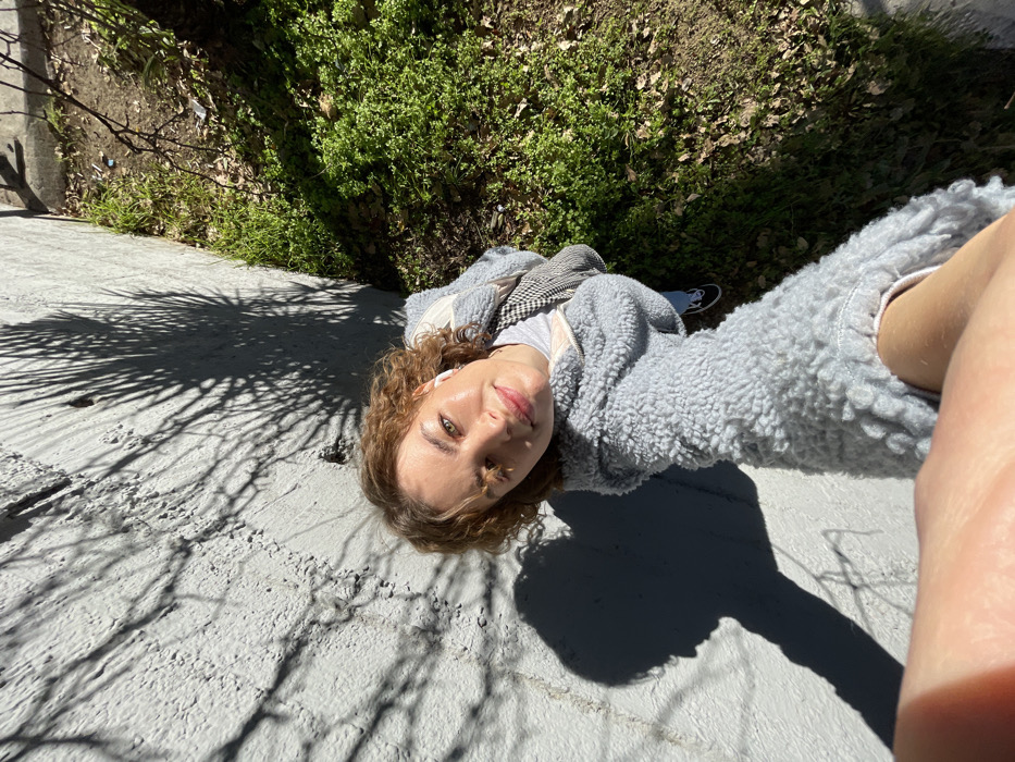 An overhead, high-angle selfie depicts a young adult female outdoors in Rafailovići, Montenegro, under bright sunlight. The female, with curly light brown hair and green eyes, smiles faintly while looking directly into the camera. She wears white earbuds, and a small yellow flower is tucked near her left temple. Her attire consists of a light grey, fuzzy jacket, a lighter-colored inner shirt, blue jeans, and black sneakers. Her outstretched right arm, holding the camera, is visible in the lower foreground. To the left of the subject is a textured light grey wall, upon which sharp shadows of foliage, including a prominent palm frond, and the subject's profile are cast. To the right of the subject is a patch of ground covered with vibrant green low-lying vegetation interspersed with dry leaves and soil.