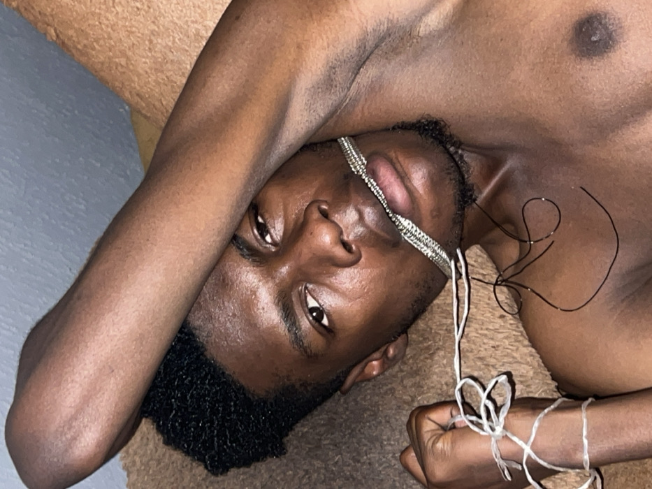 An African man is lying with his right arm above his head. He is shirtless with a beaded chain across his lips, and string tied around his hands. More string floats near his chest. His gaze is towards the viewer. The backdrop includes a carpeted area and a light wall. The image is oriented sideways.