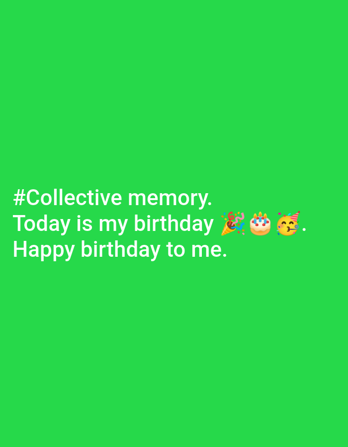 The image displays white text and emojis centered on a solid green background, indicative of a digital graphic or screen capture. The text reads: "#Collective memory. Today is my birthday Happy birthday to me." Interspersed with the text are three celebratory emojis: an exploding party popper, a birthday cake with lit candles, and a yellow face wearing a party hat while blowing a party horn. The text and emojis occupy the lower-middle section of the frame. There are no visible people, additional objects, actions, or interactions. The environment is uniformly green. The location is the city of Unknown, Unknown.