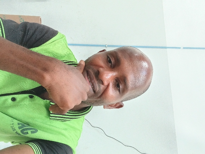 An adult male, dark-skinned with a bald head and short facial hair, is depicted in an indoor, head-and-shoulders portrait