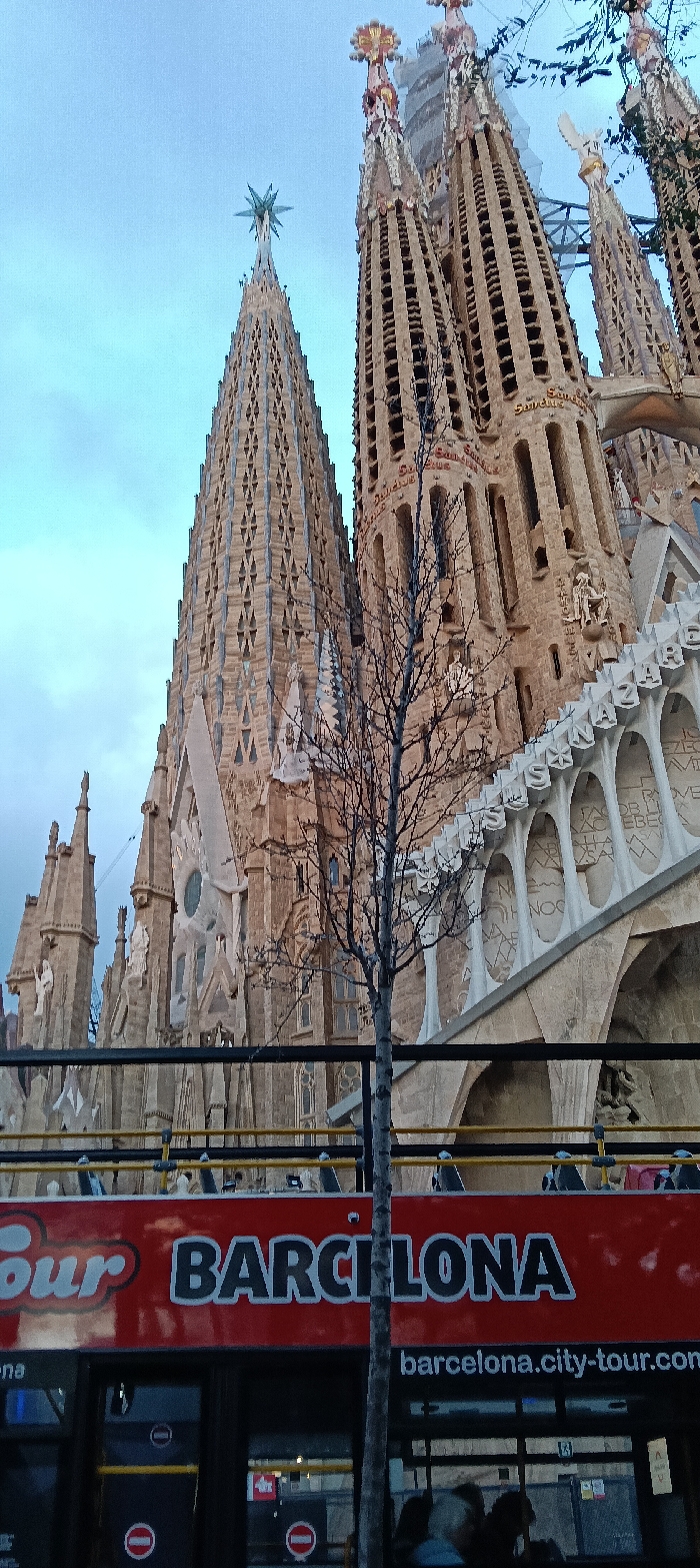 Sagrada Familia, Barcelona, rises majestically against a pale sky. Its intricate spires and facades dominate the scene, showcasing the unique architectural style. A bare tree stands in the foreground, adding a touch of winter. A red double-decker tour bus with the word "BARCELONA" prominently displayed interrupts the view, contrasting the ancient structure with modern tourism. Passengers appear blurred behind the bus windows.
