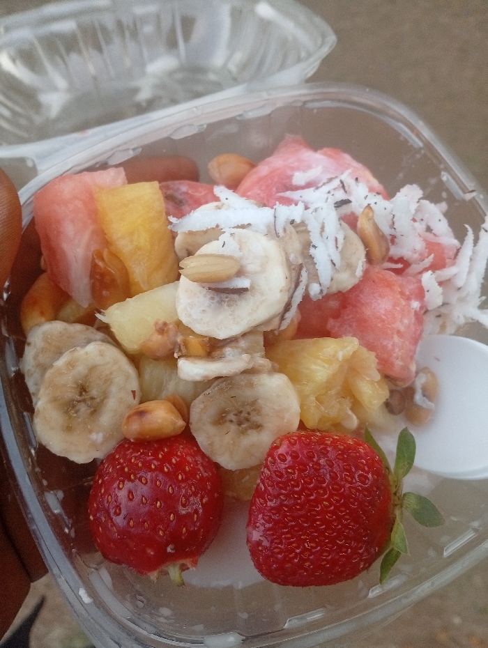A clear plastic container holds a colorful fruit salad. Chunks of watermelon, pineapple, and sliced bananas mix with shredded coconut and peanuts. Two ripe strawberries are positioned at the front, adding a touch of red. A white plastic spoon rests in the corner. Another clear plastic container is visible in the background.